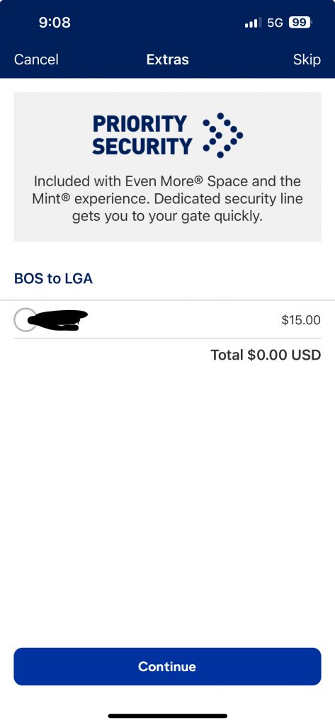 I don’t know what the fuck a check in is, but I was asked to do that. So, I asked if it was bad and was told no, and confirmed “yes, despite pouring $65 into this, I am still using a plane.” It also asked me for seat selection (why?), extra bags, and …priority security??? I wasn’t an ADA passenger, so I didn’t need priority screening. After this, it actually beget me MY TICKET?!