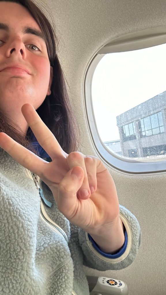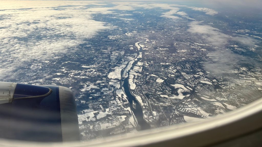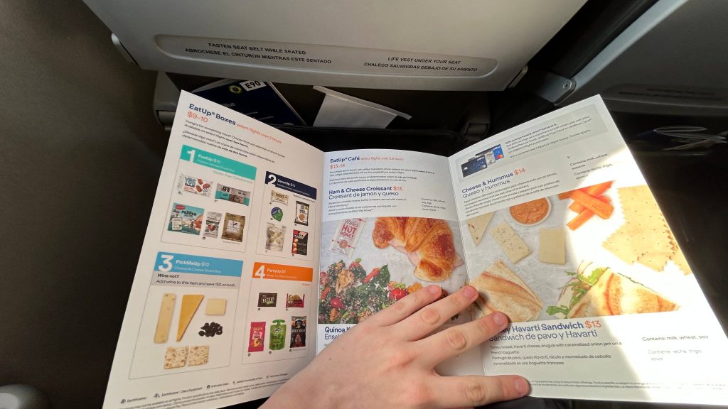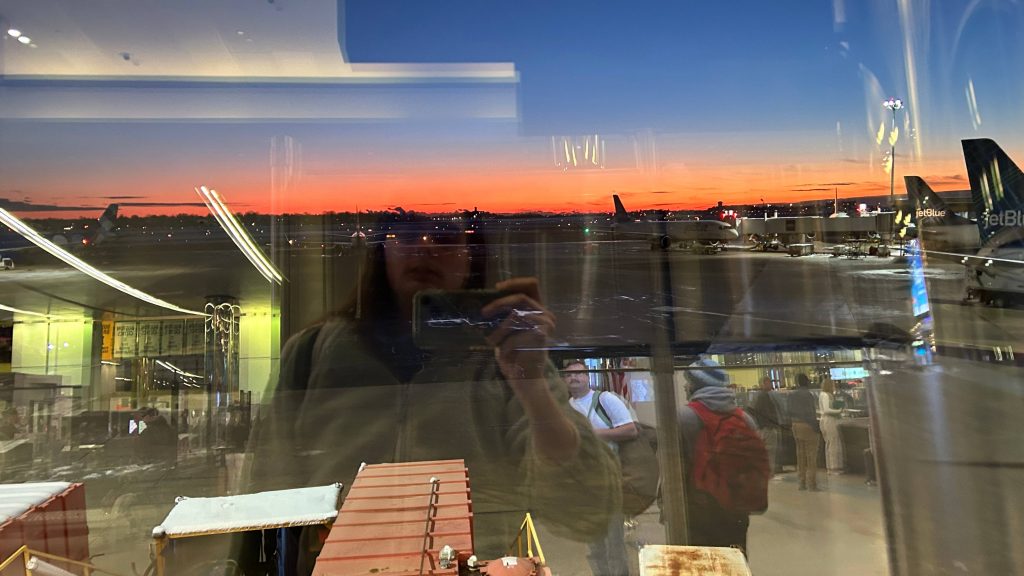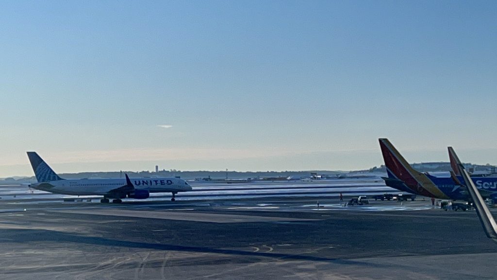 So, after this, I decided to explore the terminal a bit. There were a number of restaurants, shops, and even a couple of Dunks! Sadly, I couldn’t mobile order any Dunks here, so I had to forego it. But, I did find a gender-neutral restroom as I had to piss, and it was clean and spacious. Neat. Also, the sunrises out here are actually kinda nice, in a way. Personally, however, I’d rather my sunsets over the ocean in southern Connecticut. It was a long couple hours, but eventually 8:15 rolled around, I found the platform, and boarding began. The process was a bit weird. Of course, people with accessibility needs boarded first. That much was normal and expected and it’s generally courteous. After that were business class passengers. Lastly, I guess, would’ve been the remaining what are called “groups”. Why, coach class passengers have to be divided is beyond me and it makes little sense. But, instead, the agent just told everyone else to board, probably because the plane was far from sold out. And, I was finally on a plane. First time ever, in my life.