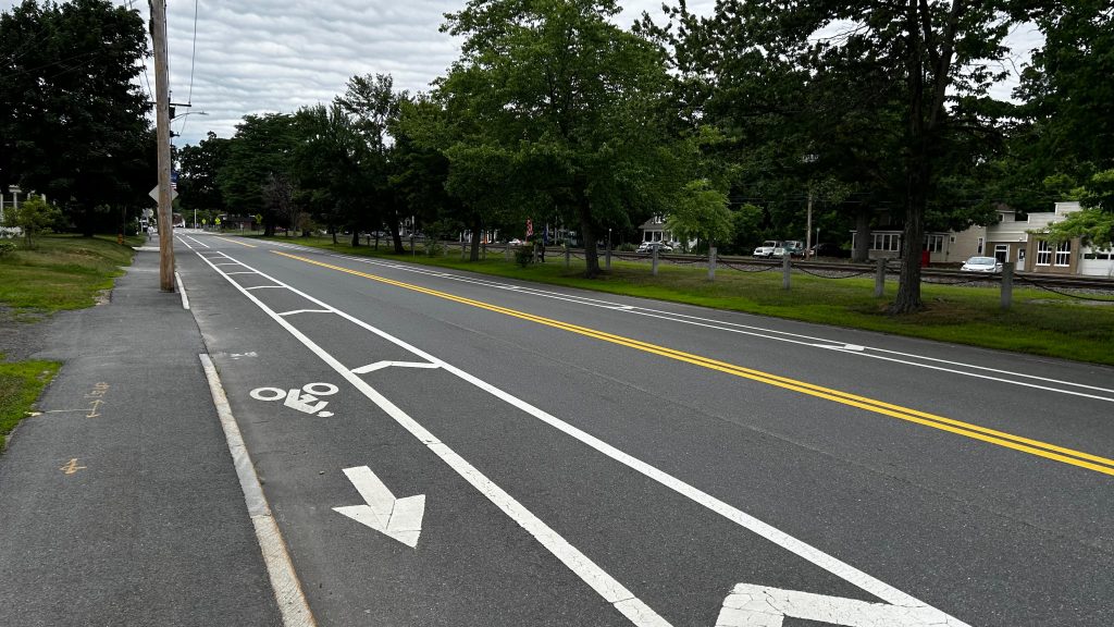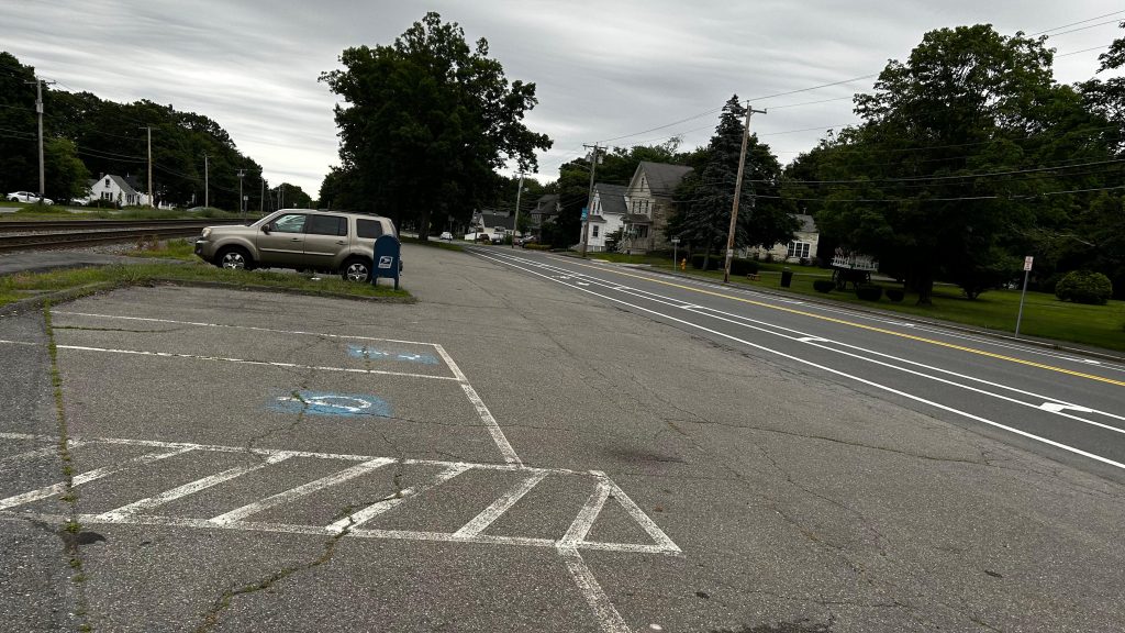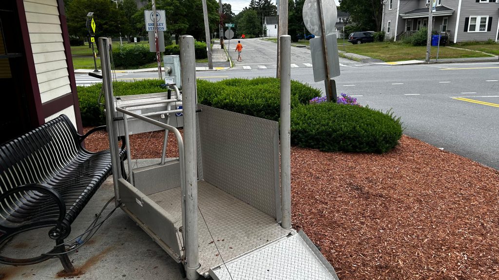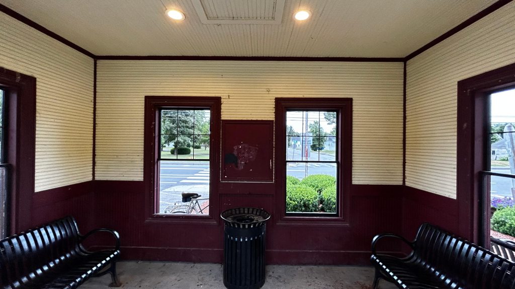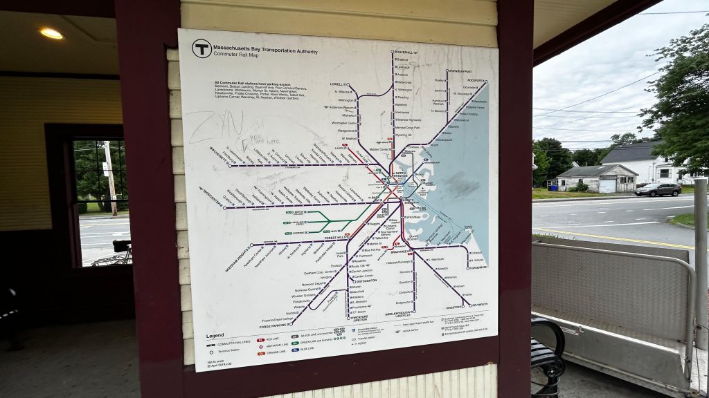So, getting off the train, they let us off in the middle of the street because that’s where the door was. The total length of the platform, including the street? About 100 feet or so. Yeah, it really isn’t long. There’s also a slab of concrete for boarding and alighting outbound trains. On the platform, you have a bench, a wheelchair lift (making this accessible technically, contrary to the system map!), and a small shelter. The map is outdated here, but for the Fitchburg Line it’s pretty accurate. The shelter, on the other hand, is pretty sad, with windows not having glass. Parking is also small but good enough given the relatively low ridership of the station. The station’s also pretty close to the town center (or, at least, the closest thing that can be considered “the town center”), and there’s even some semblance of cycling infra – with painted bicycle lanes. While it could be better, I have to give credit for effort being put in here. Good for you, Town of Shirley! Though, for cycling infra, I’d have to say that physical separation is better. Maybe a physically separated bike lane from around here to Ayer and Leominster? Either way, this station definitely has the vibes, but overall it’s meh.