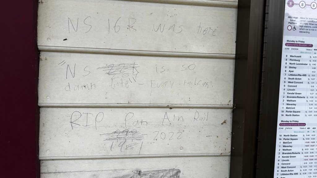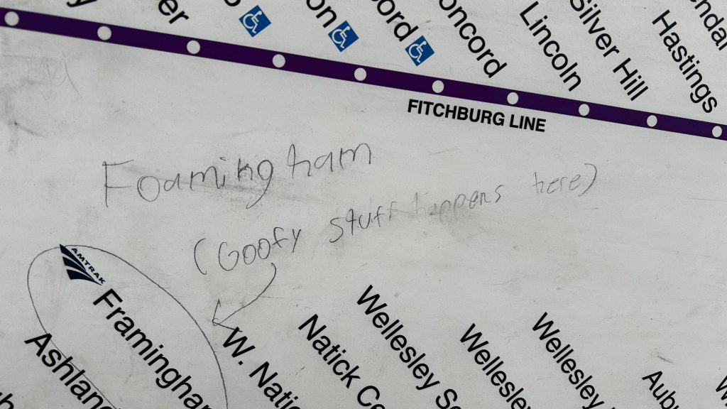 Bye!There she goes!And onwards to Wachusett!Outdated map!FOAMINGHAM. GOOFY STUFF HAPPENS HERE.This looks nice but there’s no physical window.Parking and bike lanes!Old Commuter Rail station signYOU MEAN THIS IS ACCESSIBLE?!Another shot of the red dot matrix signage and the HelveticaBoston & Maine-esque signageBike lanes!Some stuff around town!Towards the fire stationCycling infrastructure!Towards Boston!Towards Fitchburg and Greenfield!“NS 16R WAS HERE” and “RIP PAN AM RAIL”“[CSX] <- HOW TOMORROW DERAILS”Bye, Shirley!