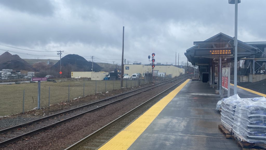 Heading out onto the footbridge, it reminded me of Canton Junction with all the metal, but slightly less bad. There’s a long ramp for accessibility, a high-level island platform, more yellow dot matrix signs (no departure board anywhere?! I feel like this station would REALLY benefit from one!), and the usual benches and wastebaskets. Also, WHY IS THERE NO PEDESTRIAN ACCESS TO THE INDUSTRIAL AREA NEXT TO THE STATION?! THIS WOULD LITERALLY BE A PERFECT REVERSE COMMUTE OPPORTUNITY!!! WHAT THE FUCK?! Also, they left the pavement salt outside.