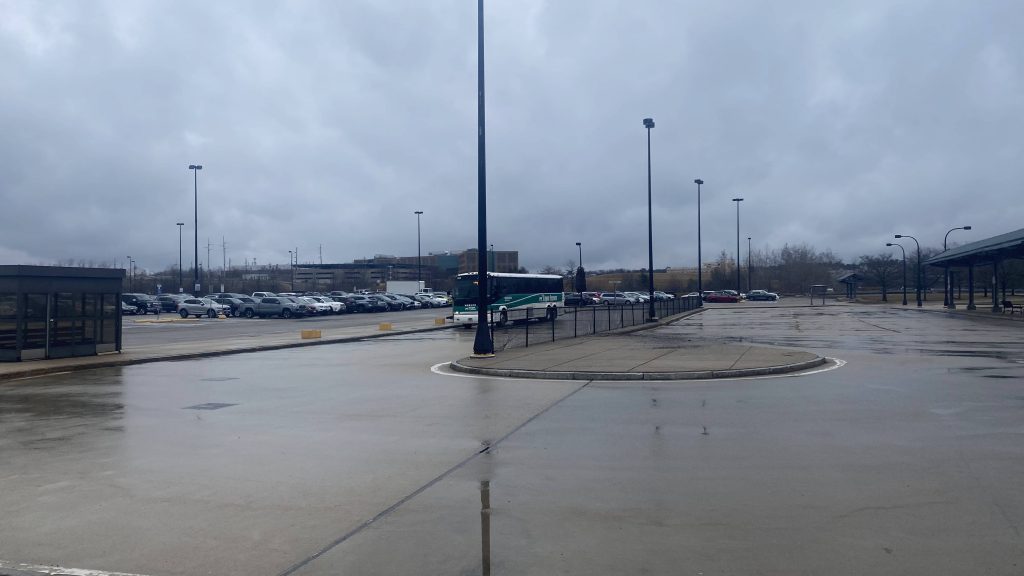 Starting off, there’s a small pickup/dropoff area along with several bus berths. I think they might be heated, but I’m not sure. However, there is an information booth out here, along with benches and wastebaskets. Neat! You can also see the Commuter Rail ROW as well.