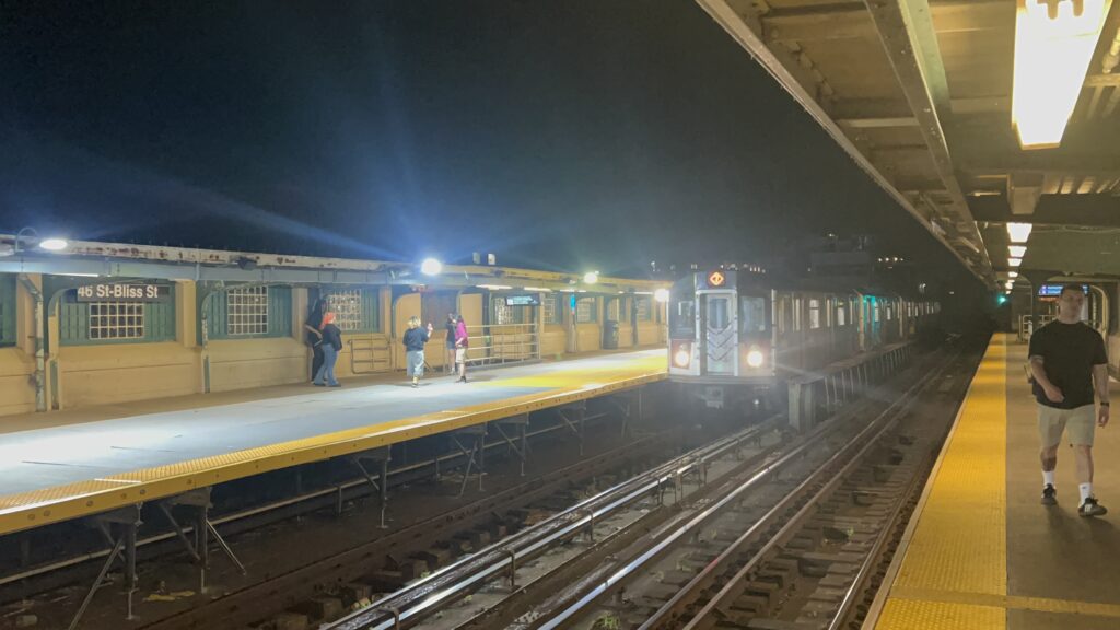 This goes kinda hard.Oversized platform!Fare control!Street levelThe stairs looking downI see…a skyline.A nighttime shot…a diamond 7???? Oh, right, it’s the super-express 7 that they run on Mets game nightsAnd a normal 7 to Flushing